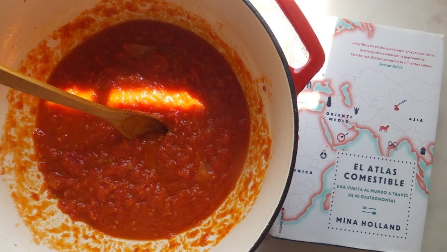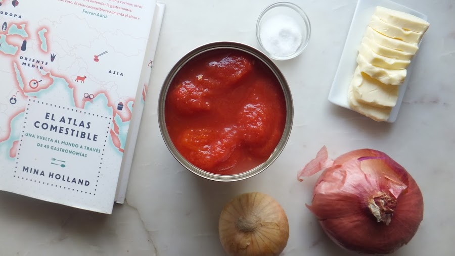 Con el tiempo descubrí a la difunta cocinera y escritora italoamericana marcella Hazan, conocida por haver llevado los secretos de la cocina italiana a las cocinas de habla inglesa con libros como The essentialas of classic Italian cooking. Las instrucciones de Hazan consistían en vaciar una lata de tomates en una sartén con dos mitades de cebolla hacia abajo y una nuez generosa de mantequilla, taparla y dejar hacerse a fuego lento, con la llama más pequeña del mundo, durante 45 minutos. A los veinte minutos emepecé a oler lo que se estaba cociendo... ¡Lo había conseguido! Estaba haciendo la salsa de pomodoro perfecta con solo cuatro ingredientes (la sal se echa al final). Después de todo el lío resulto que solo hacía falta mantequilla, la dulzura de una cebolla y una cocción muy lenta para que los tomates brillaran en todo su esplendor." Mina Holland, El atlas comestible.