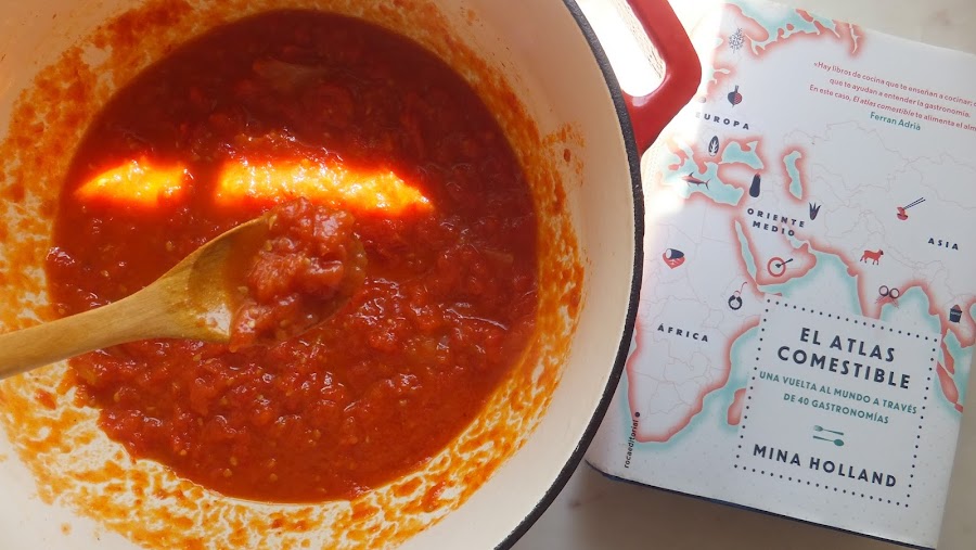 Con el tiempo descubrí a la difunta cocinera y escritora italoamericana marcella Hazan, conocida por haver llevado los secretos de la cocina italiana a las cocinas de habla inglesa con libros como The essentialas of classic Italian cooking. Las instrucciones de Hazan consistían en vaciar una lata de tomates en una sartén con dos mitades de cebolla hacia abajo y una nuez generosa de mantequilla, taparla y dejar hacerse a fuego lento, con la llama más pequeña del mundo, durante 45 minutos. A los veinte minutos emepecé a oler lo que se estaba cociendo... ¡Lo había conseguido! Estaba haciendo la salsa de pomodoro perfecta con solo cuatro ingredientes (la sal se echa al final). Después de todo el lío resulto que solo hacía falta mantequilla, la dulzura de una cebolla y una cocción muy lenta para que los tomates brillaran en todo su esplendor." Mina Holland, El atlas comestible.