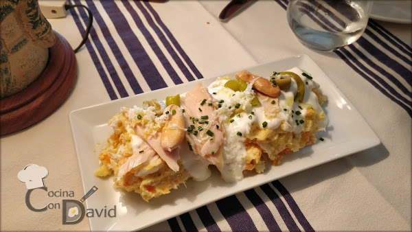 1/2 Ración de Ensaladilla Rusa. Ensaladilla densa de patata y zanahoria coronada con lascas de ventresca, guindillas, mayonesa ligera y picos de pan. Ese punto ácido de la guindilla me encanta.