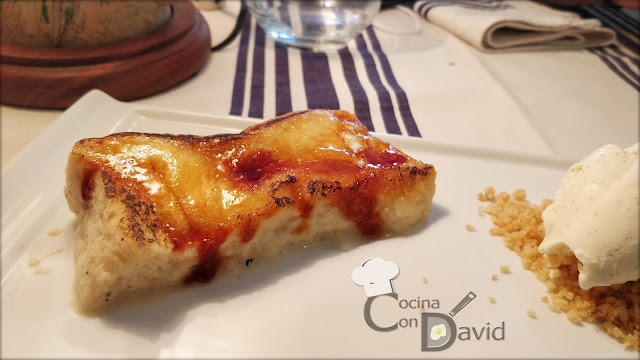 Torrija caramelizada. Una de las mejores torrijas que he comido hasta la fecha, es una torrija nivel Dios. Muy cremosa, templadita y con ese dorado crujiente del caramelo por encima. Se acompaña de un helado cremoso. Postre obligatorio, buenísima.