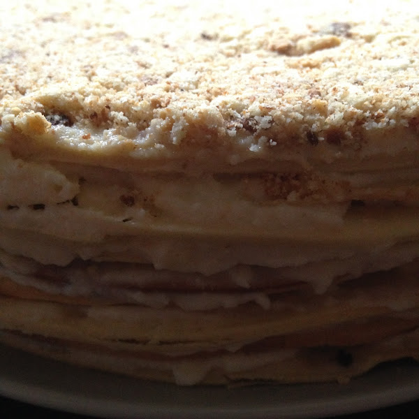 Mi unica tarta preferida. La receta no esta muy dificil: la masa de harina, agua y margarina, y la crema de mantequilla y leche condensada. NO esta nada saludable! Pero esta deliciosa! La pena que hacer obleas finitos tarda mucho, en total el proceso dura 2,5-3 horas. Por eso esa tarta tan rica y tan mala comemos solamente 2-3 vezes al año - por mi cumple (como de hoy), a cumple de mi marido y a noche vieja.