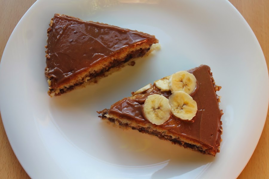 Encontré la receta de esta tarta en la página de Postreadicción (gran descubrimiento, por cierto!!), y vi que llevaba cosas tan ricas como una crema de nutella o ganaché de chocolate. Vamos, que el plátano era lo de menos, pero resultaba que tenía todos los ingredientes en casa (sím tengo Nocilla en casa, qué pasa!) así que, al lío!!