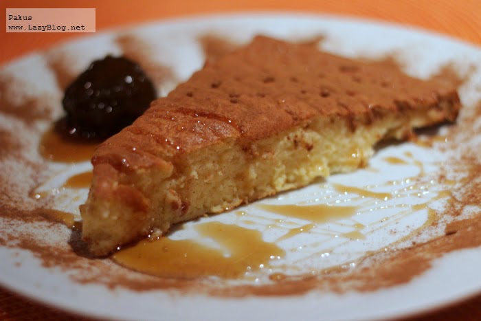 Nos comimos el bife con deleite y casi no llegamos al postre, otra maravilla de la casa, elaborado con piñones y almendras, una especie de tarta de santiago más húmeda y cremosa cubierta de canela. La compartimos.