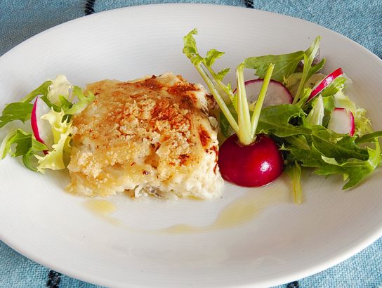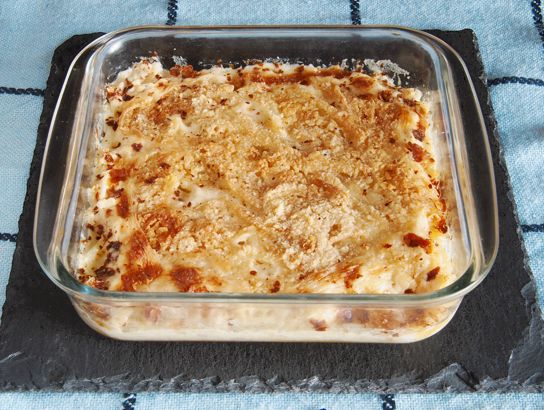 Untamos con un poco de mantequilla una fuente para horno y vamos colocando una capa de patatas, otra de cebolla y otra con las anchoas bien escurridas. Acabamos con otra capa de cebolla y otra de patatas. (Salpimentamos al gusto entre cada capa, pero recuerde que las anchoas suelen estar más que suficientemente saladas).
