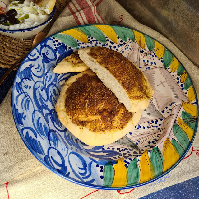 INGREDIENTES:MANAQISH : Harina normal 350 gr. levadura instantánea 15 gr. o bien levadura seca activa - 2 cucharadas, 250 gr de agua tibia , 1 cucharada de azúcar, 1 cucharada de sal