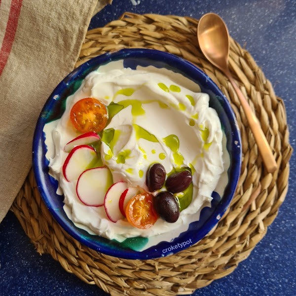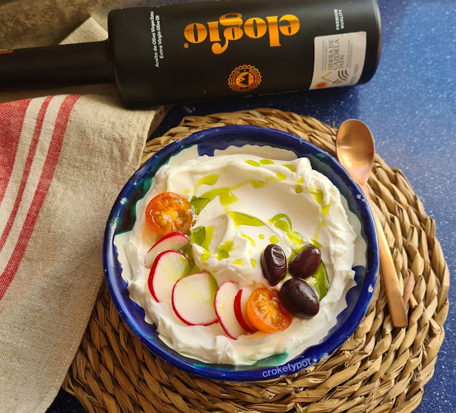 LABNEH: 4 yogures griegos, aceite de oliva AOVE y los toppings de nuestro gusto, tomate, rábano, aceitunas negras, lo que más os guste.