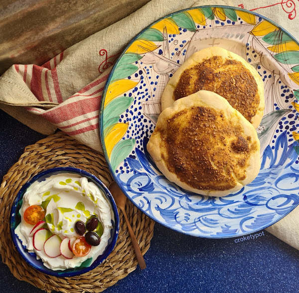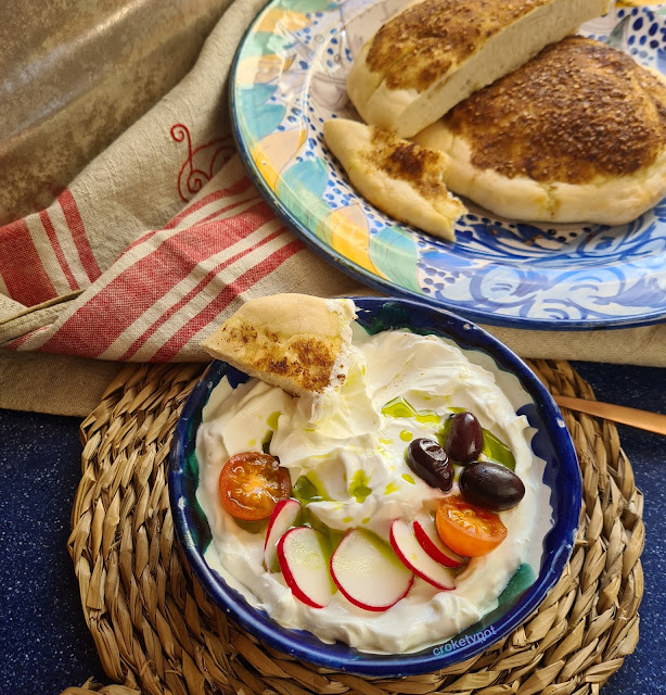 He preparado un combinado que allí lo toman en el desayuno, que consiste en labneb casero, es muy típico en Oriente Medio elaborar queso con yogurt y un pan plano de za´atar, llamado manaqish para untar el queso que resulta una delicia.