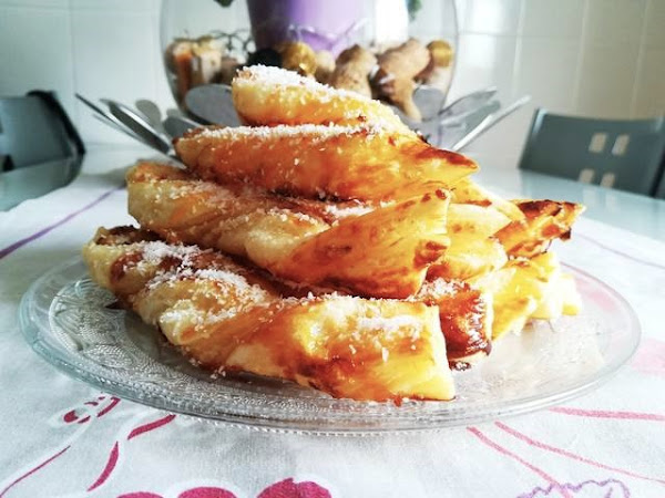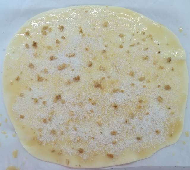 2. Desenrollamos la masa de hojaldre y untamos una fina de capa de la mezcla hecha anteriormente. Le añadimos coco rallado y las nueces picadas.