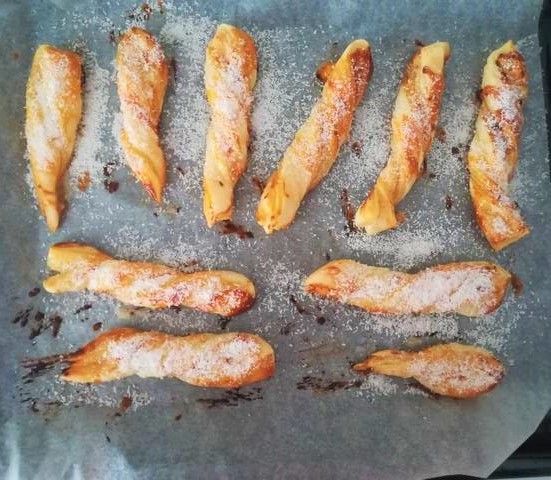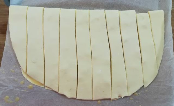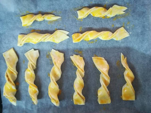 4. Enrollamos las tiras sobre sí dos veces o más si se puede y ponemos en una bandeja de horno forrada con papel de horno. Pintamos un poco con la yema para que al hornearlas se queden doradas.