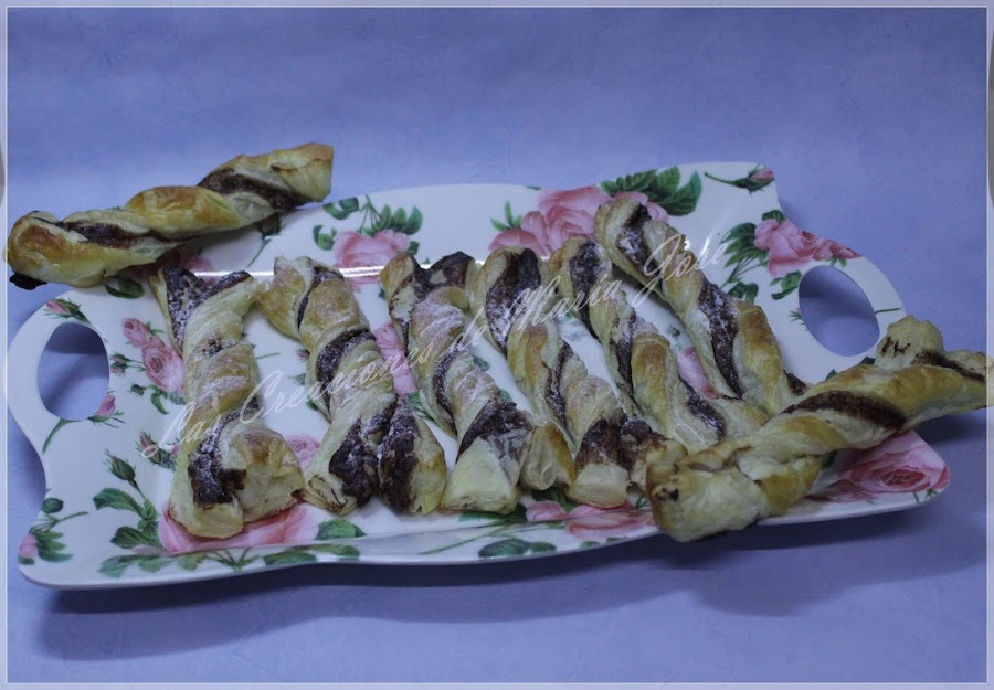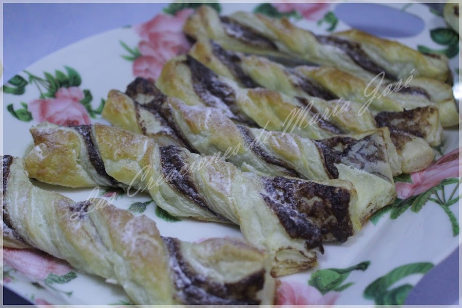 Untamos una masa de hojaldre de nocilla. Cuando este untada ponemos la otra encima. Vamos cortando en tiras, del grosor que queramos.