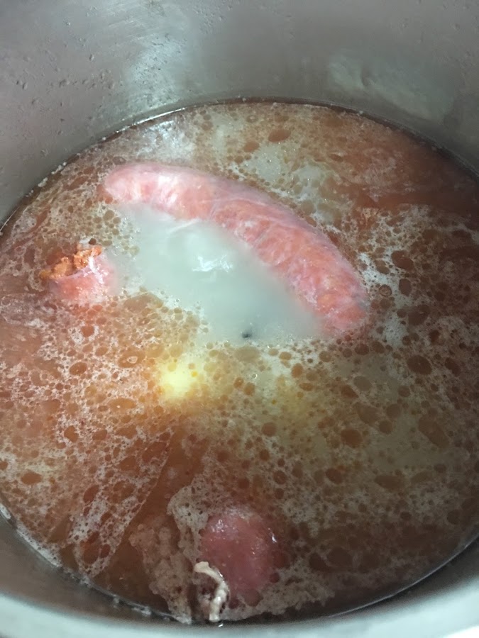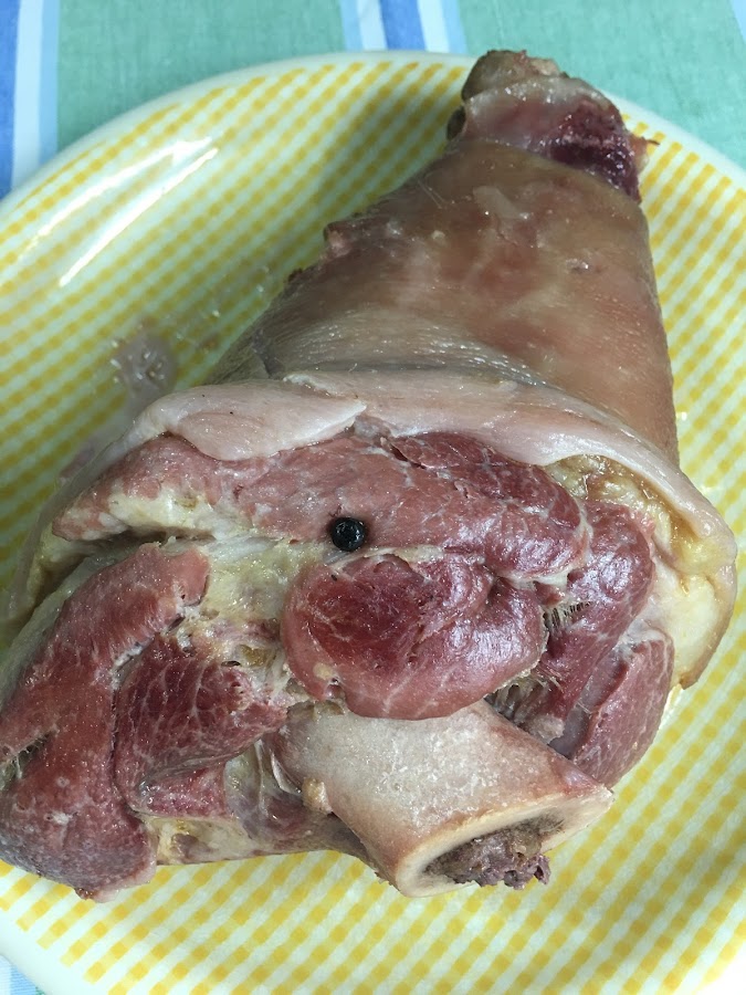 Se pone a cocer el lacón cubierto de agua, sin sal, con unas bolas de pimienta negra, durante 2 horas. Yo utilicé la olla express.