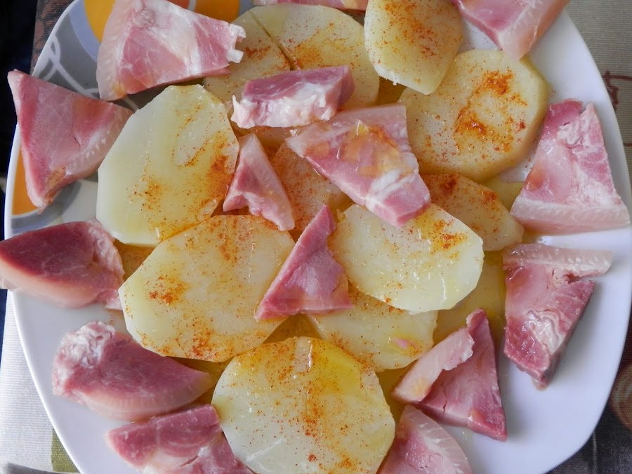 Cortamos el lacón en filetes y lo ponemos en un plato con las patatas.