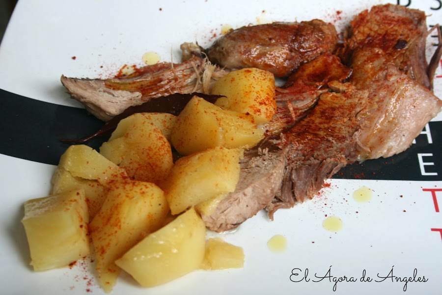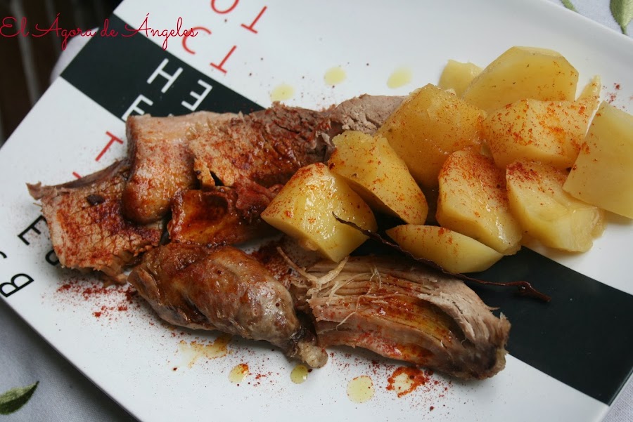 Servimos en una fuente con pimentón al gusto (dulce o picante o ambos) y aceite de oliva virgen extra.