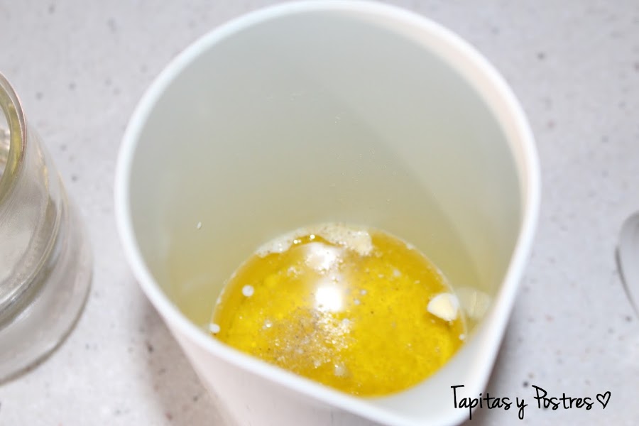 Ponemos en el vaso de la batidora todos los ingredientes a la vez, menos el zumo de limón y batimos sin mover la batidora hasta que vemos que la salsa ha espesado, entonces añadimos el chorrito de limón y batimos otra vez.