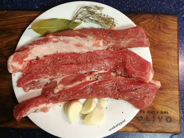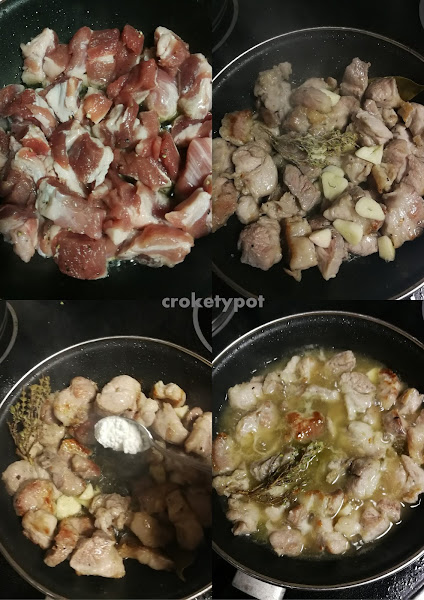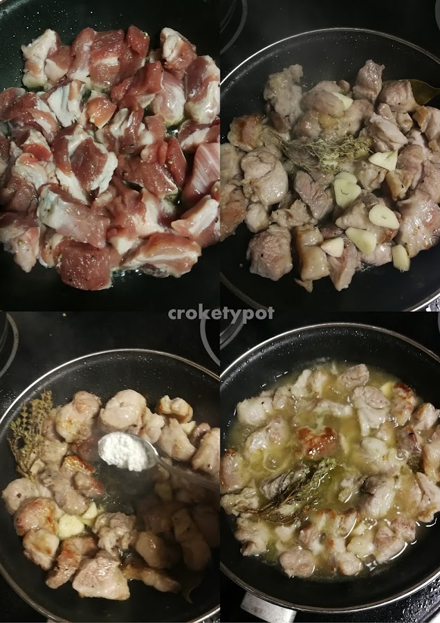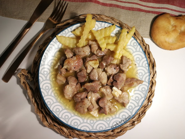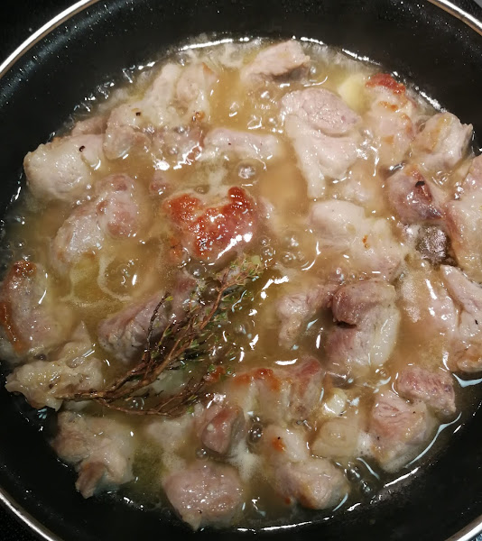 INGREDIENTES (2 personas): 400gr de Lagarto ibérico, 200ml de Vino blanco, 1 hoja de laurel, un poco de tomillo seco, la punta del cuchillo de comino, 4 dientes de ajo, pimienta negra, 1 cucharadita de Maicena, aceite de oliva AOVE.