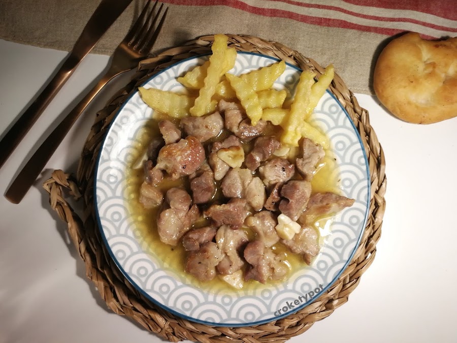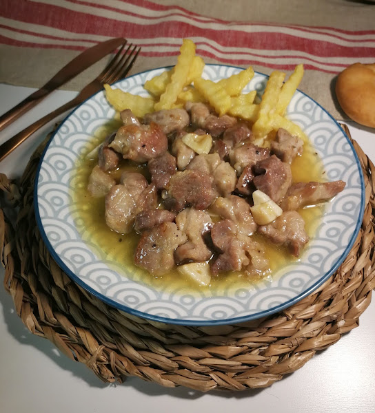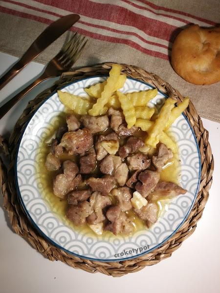 Servimos acompañados de patatas fritas o unos champiñon salteado que es lo que mejor para este plato. No olvidar el pan para mojar en la salsa.