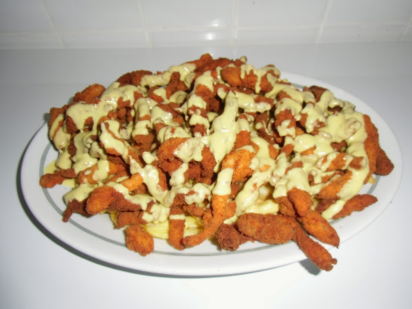 En una sartén con abundante aceite caliente freímos las lágrimas hasta que cojan un color dorado, las ponemos sobre un papel absorbente y luego las emplatamos con una cama de patatas fritas y con la salsa por encima.
