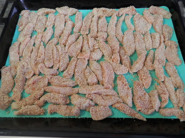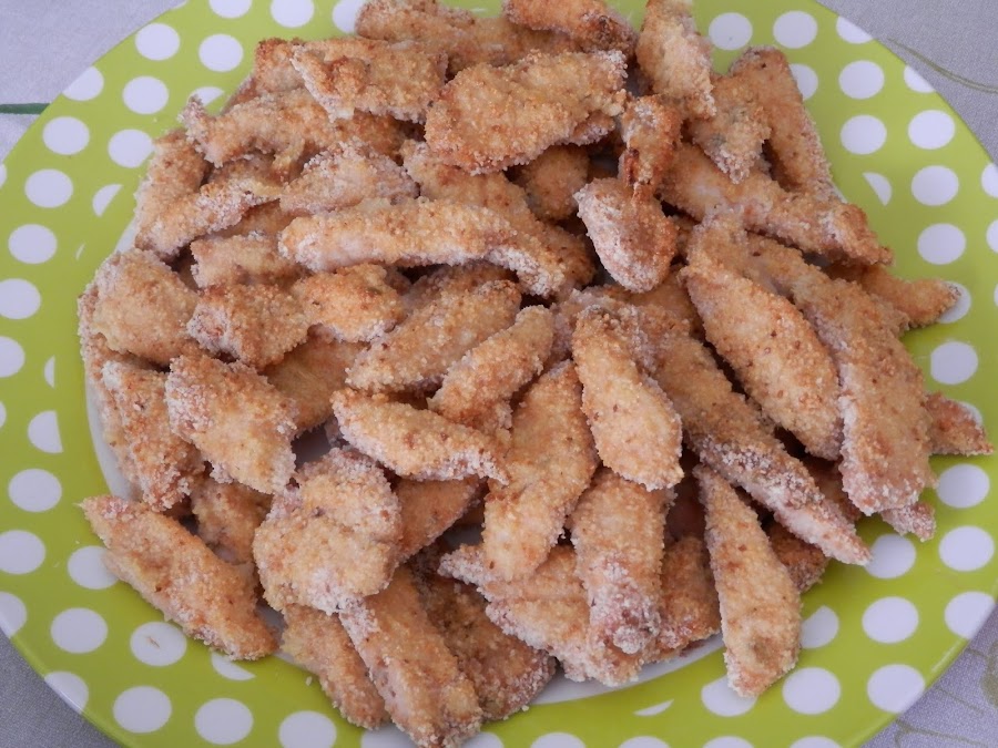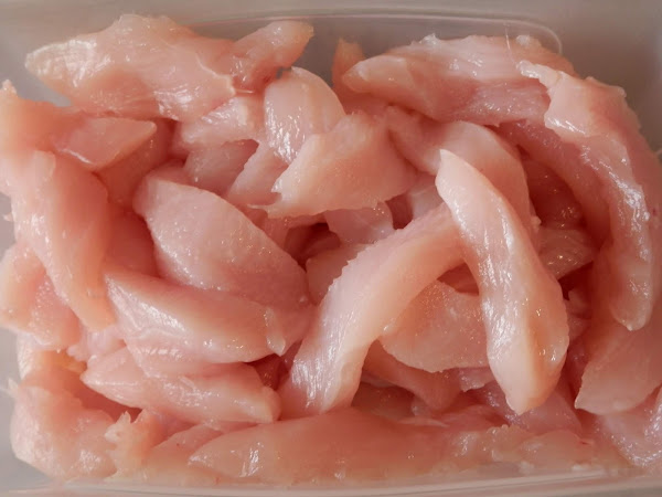 En primer lugar, corta las pechugas en tiras finitas y de unos dos ó tres dedos de largo.