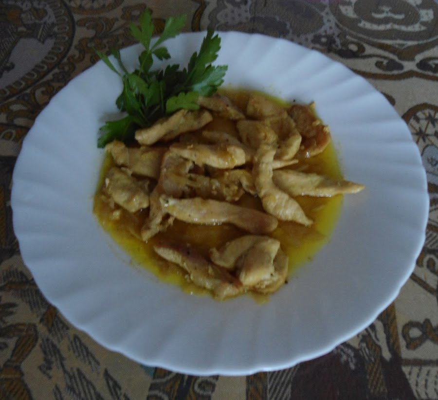 Ponemos una sarten con aceite en el fuego y echamos la cebolla cortada en juliana y los ajos en rodajas finas, cuando está la cebolla pochada y los ajos doraditos echamos el curry, el vino blanco movemos hasta que se evapore el alcohol de vino, vertemos el agua y la leche y dejamos que se cocine hasta que se forme una cremita, echamos las lagrimitas de pollo y dejamos que se termine de hacer para que se mezclen todos los sabores y a disfrutar.