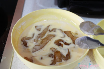 Escurrimos las tiras de pollo del aliño y las vamos pasando por la masa del rebozado.