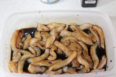Mezclamos los ingredientes del aliño y dejamos las tiras de pechuga de pollo en él durante una hora al menos.