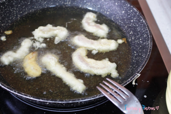 Es algo tan simple como unas tiras de pollo empanadas. Pero para hacerlas más gustosas, las macero un rato en un aliño que les da muy buen sabor.
