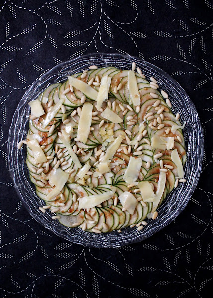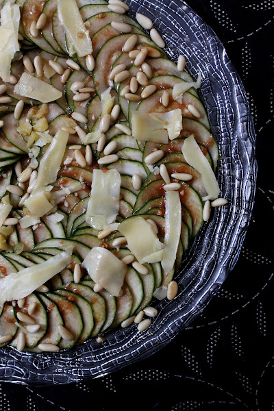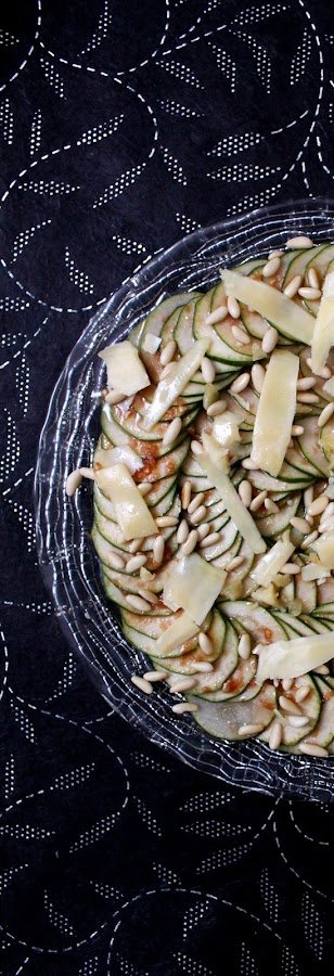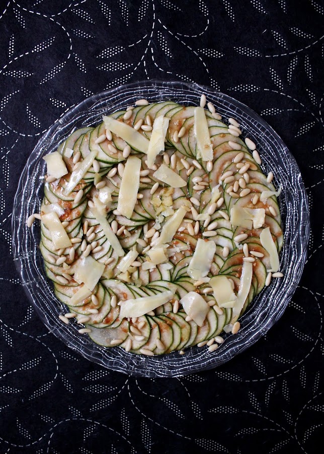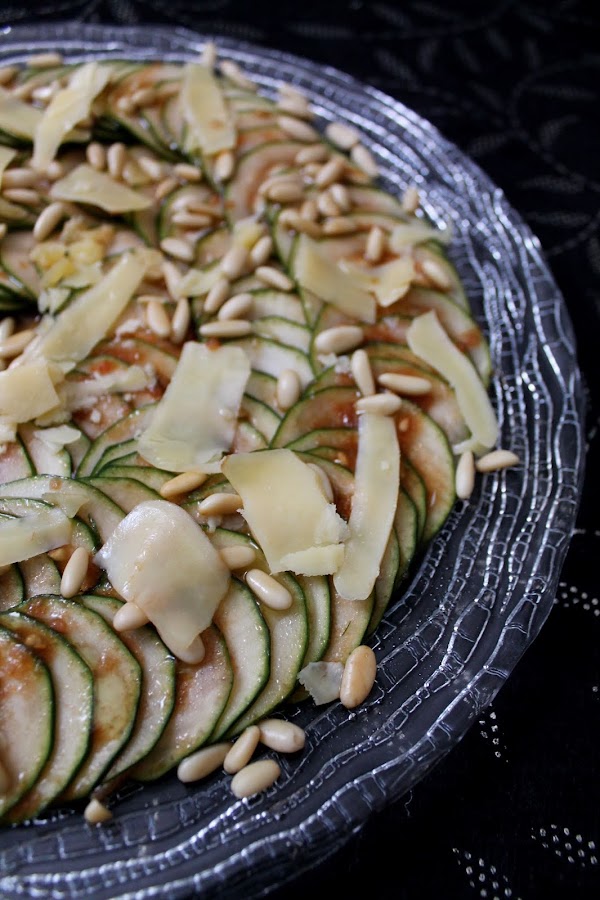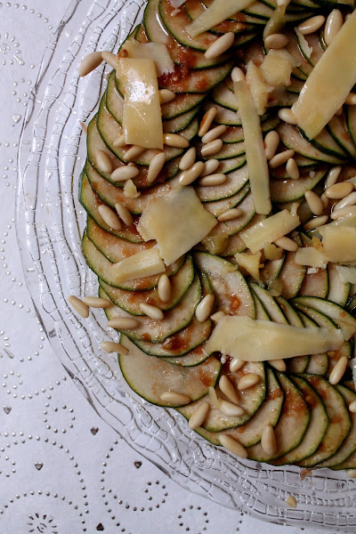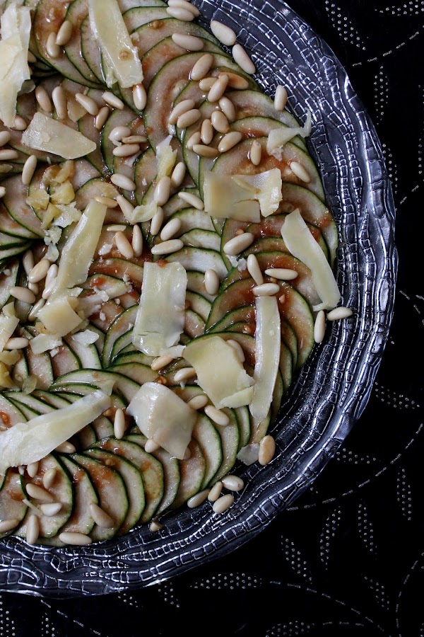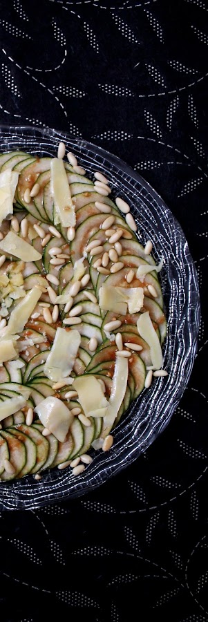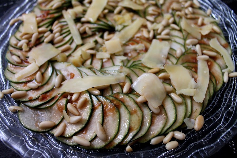 Este plato son finas láminas de calabacín con cositas ricas como el tomate y los piñones y con otras cositas más ricas aun como son el aceite de trufa y el queso. Supongo que a estas alturas ya sabréis mis gustos culinarios ;)