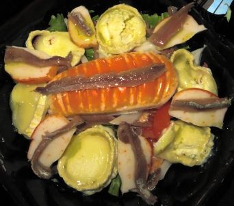 Sobre el fondo de brotes de lechuga, poner alrededor del plato el queso de cabra cortado. Entre queso y queso, una loncha de cola de langosta. En el centro, la cola que no hayamos loncheado y encima de la langosta loncheada y de la entera, un filete de anchoa.