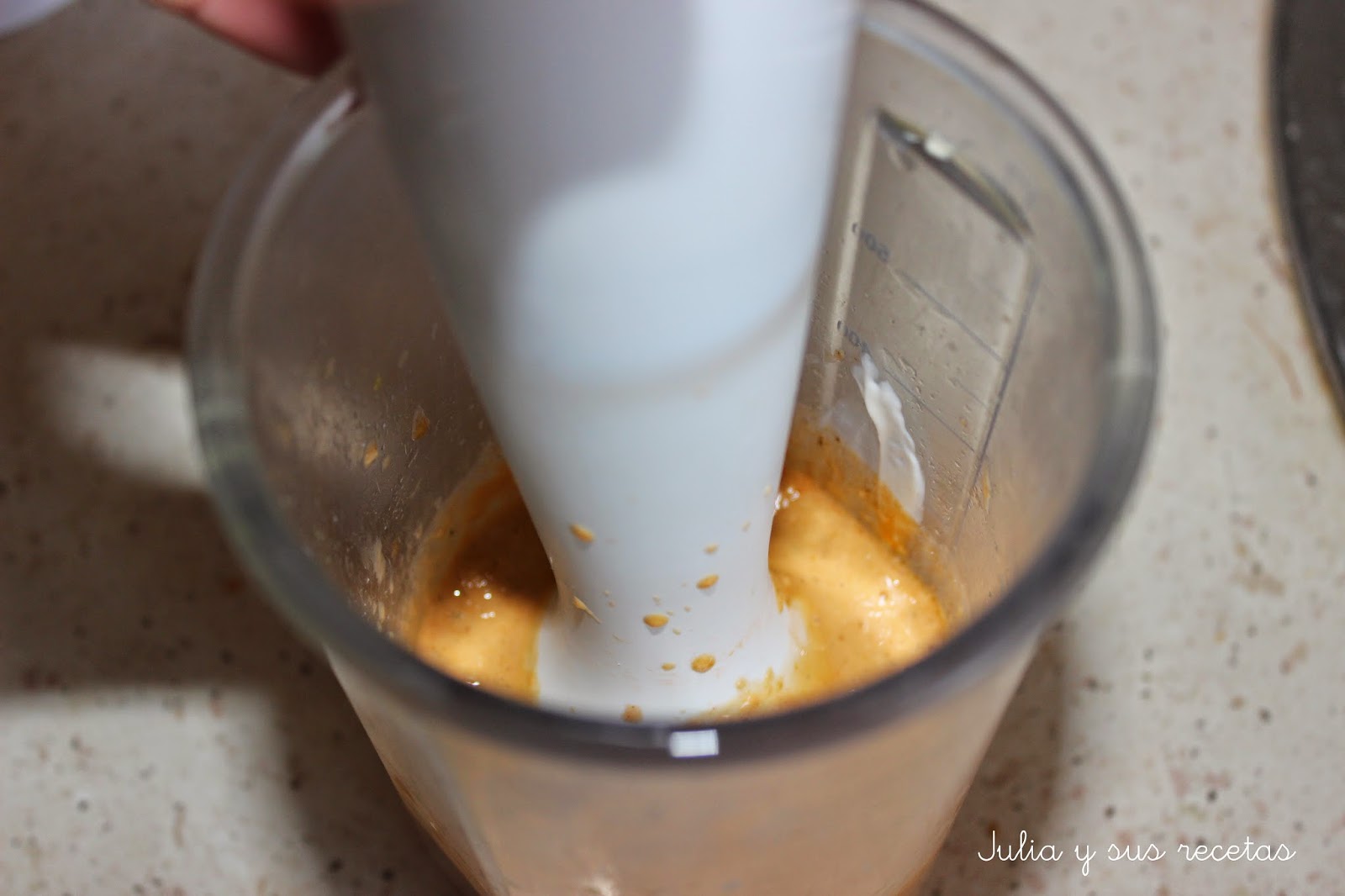 Una vez fría la salsa triturada le añadimos la mostaza y la mayonesa y mezclamos bien.