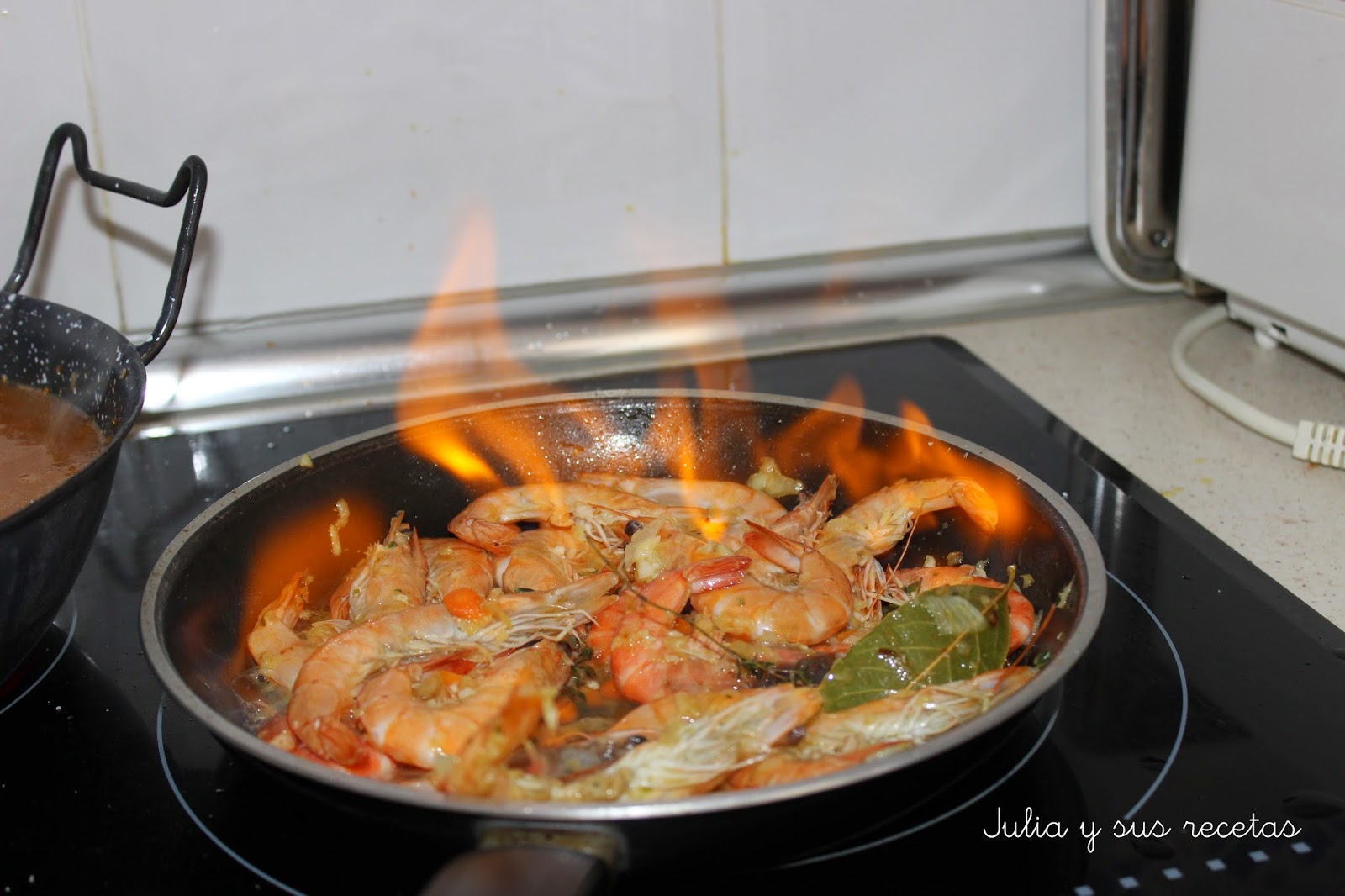 Cuando se apaguen las llamas añadimos la copa de vino blanco, dejamos hervir 1-2 minutos , apartamos del fuego y sacamos los langostinos y la hoja de laurel.
