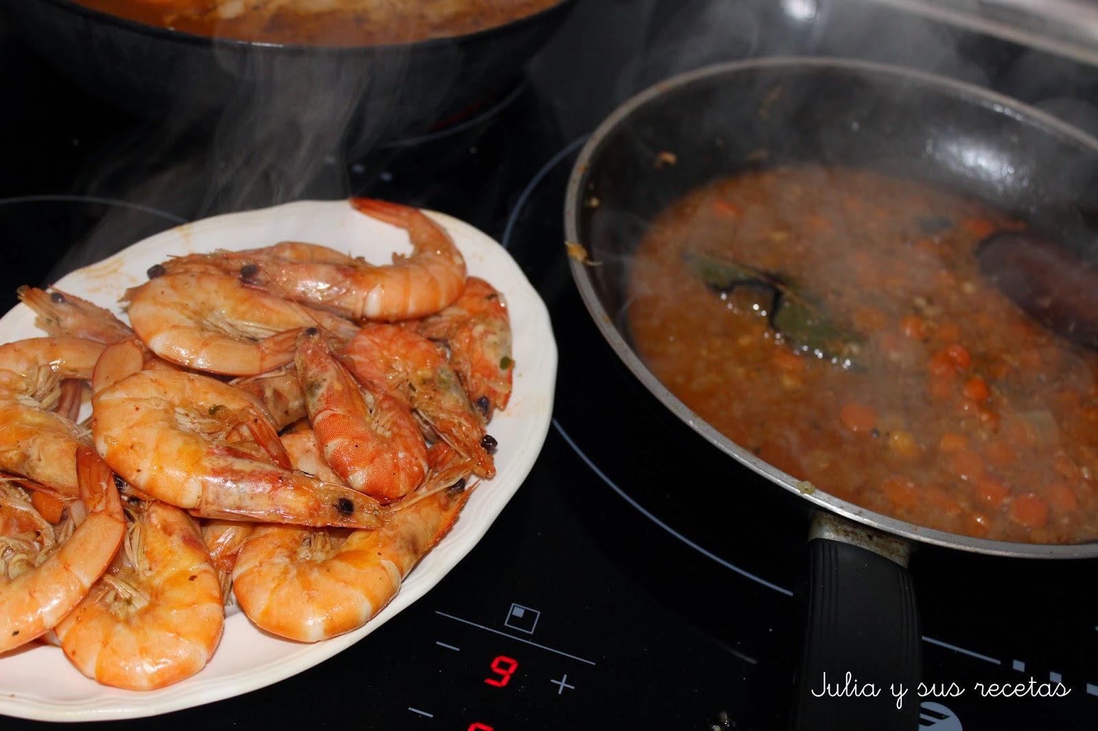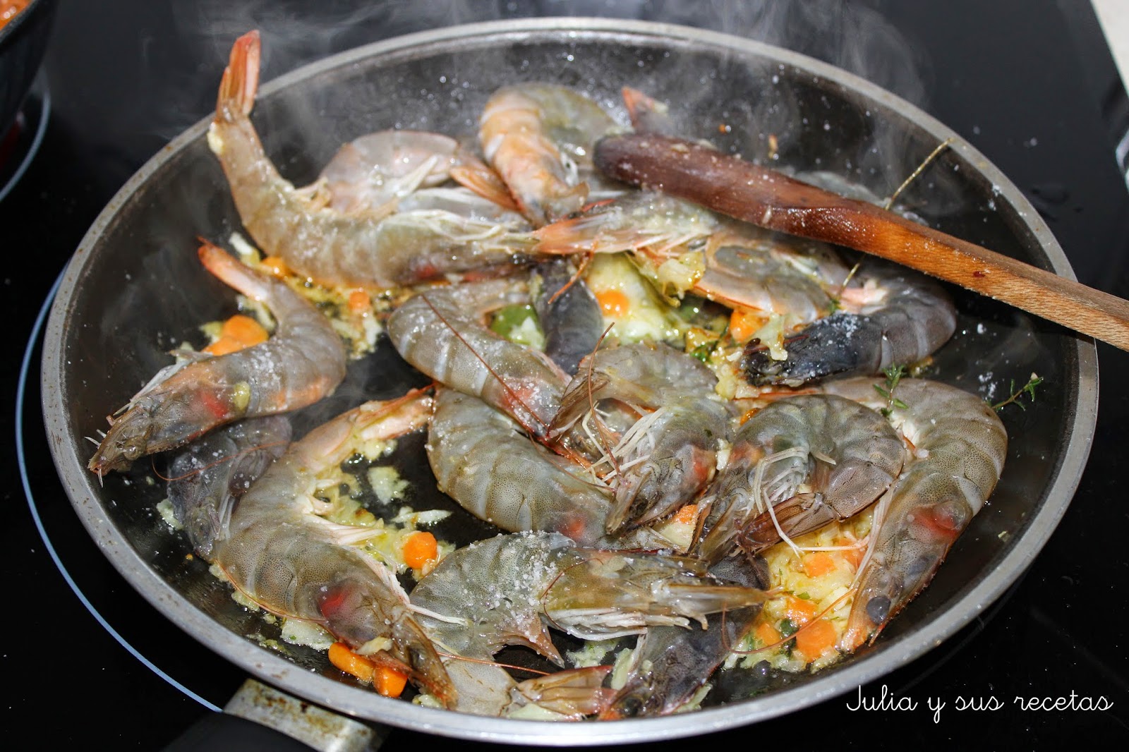 Añadimos los langostinos y los sofreímos un poquito