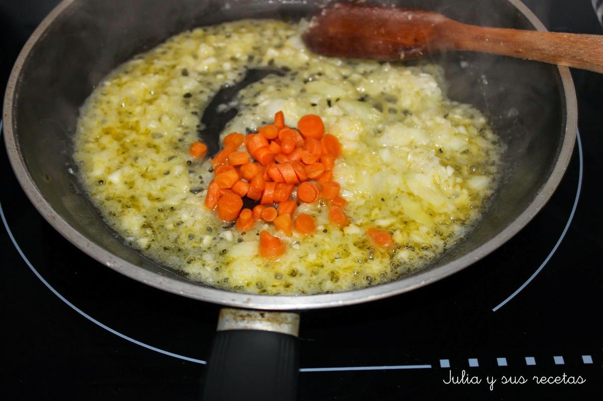 En una sarten ponemos la mantequilla o aceite y sofreímos la cebolla, los ajos y la zanahoria.