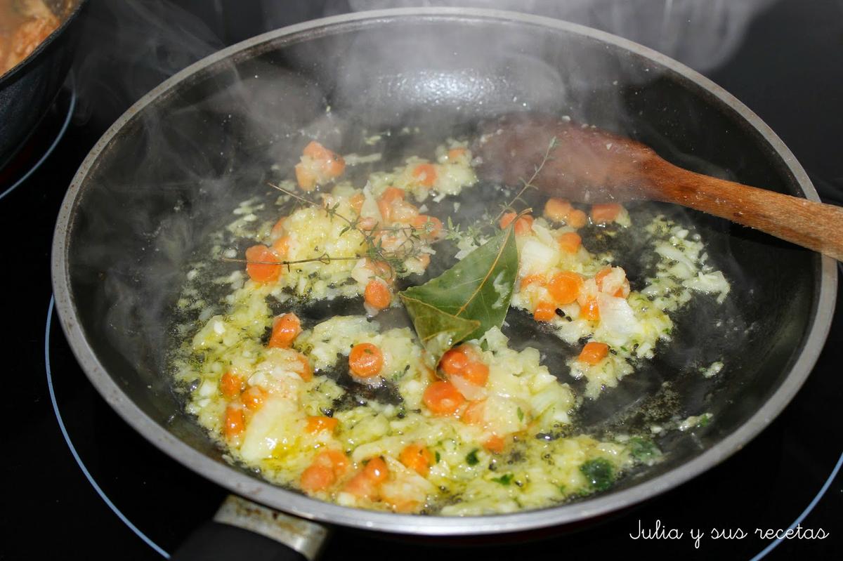 Cuando estén sofritos añadimos el perejil, el tomillo y el laurel