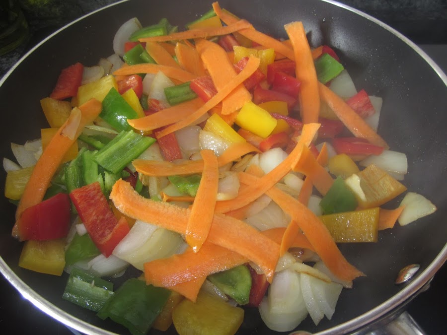 En una sartén amplia, ponemos aceite y empezamos a sofreír la cebolla, los pimientos, y la zanahoria, a fuego medio,sazonamos, el punto de las verduras es a gusto de cada uno, yo lo dejo al dente.