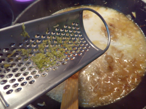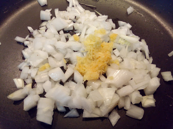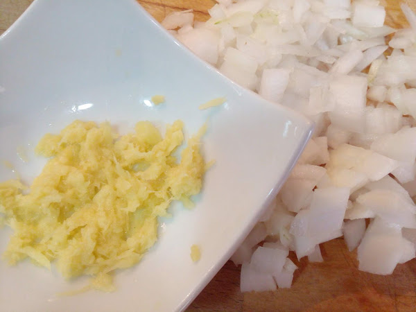 Picar la cebolla en trozos pequeños y rallar el jengibre (aproximadamente dos cucharadas soperas).