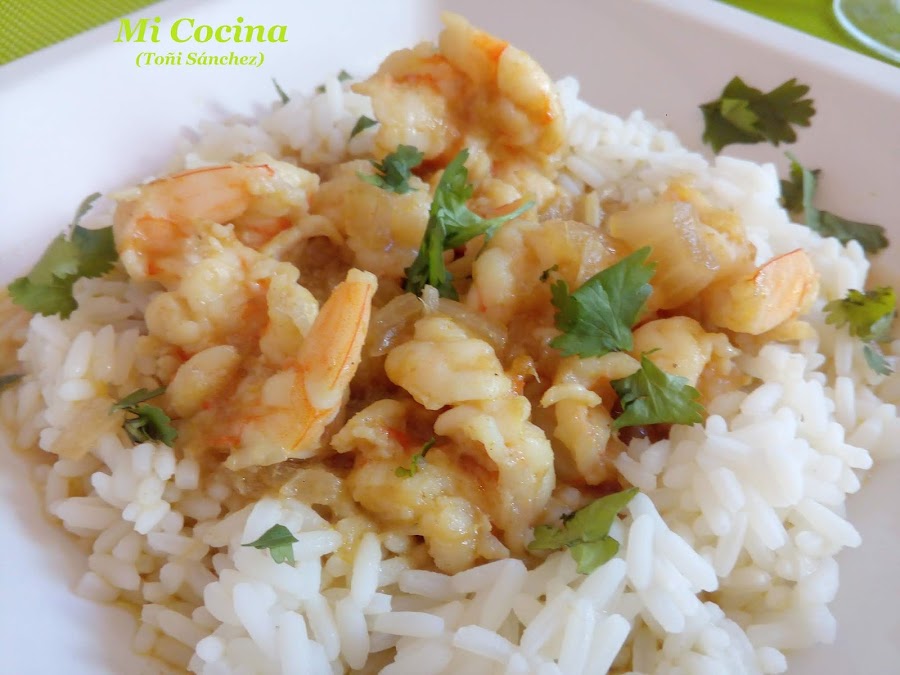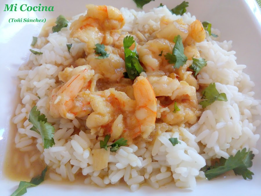 Mientras cocer el arroz siguiendo las instrucciones del fabricante. Escurrirlo bien, colocarlo en el plato donde se vaya a servir y esparcir por encima el curry de langostinos, siendo generoso con su salsa. Adornar el plato con cilantro fresco picado.