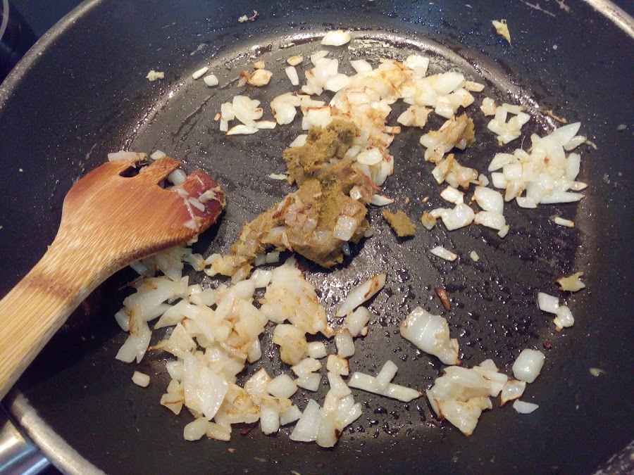 En una sartén o wok echar el aceite y saltear la cebolla junto con al jengibre durante dos o tres minutos, con cuidado de que no se llegue a quemar la cebolla (sólo que esté dorada).