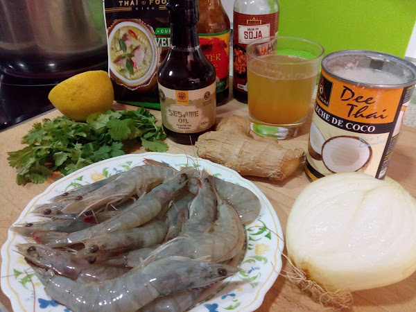 20 langostinos grandes, dos cucharadas soperas de aceite de sésamo, media cebolla grande blanca (tipo cebolleta), un trozo de jengibre fresco, 200 ml. de leche de coco, dos cucharadas soperas de pasta de curry verde, un vaso de caldo de pescado, una cucharada sopera de salsa de soja, una cucharada sopera de salsa de ostras, una cucharada sopera de ralladura de limón, dos cucharadas soperas de zumo de limón y una ramita de cilantro fresco.