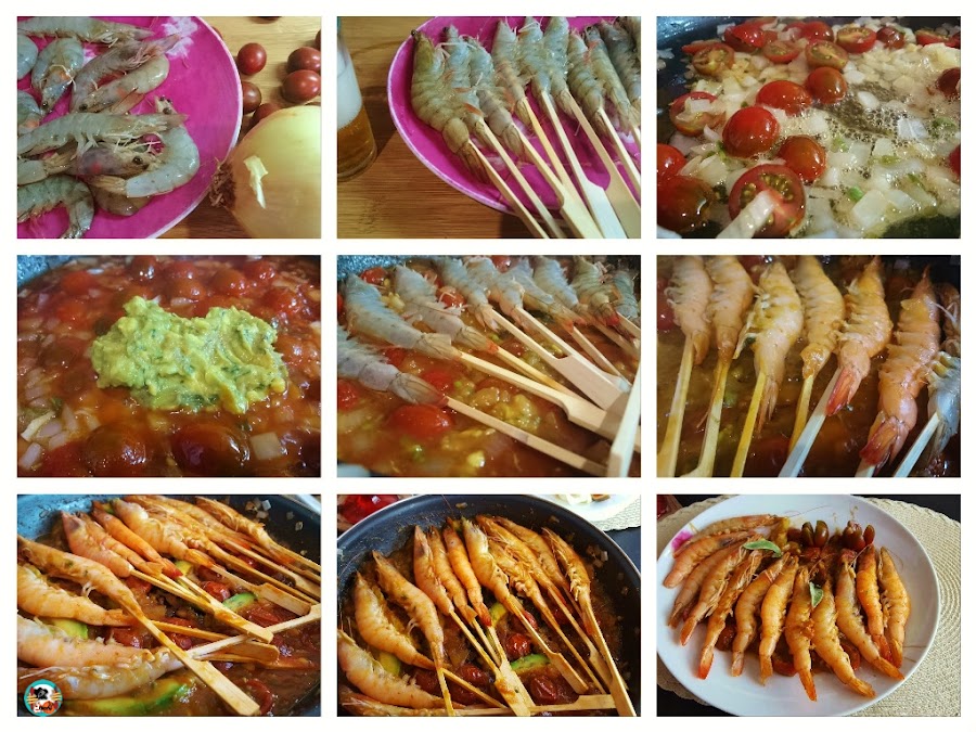 Langostinos al horno con tomates, elaboración: