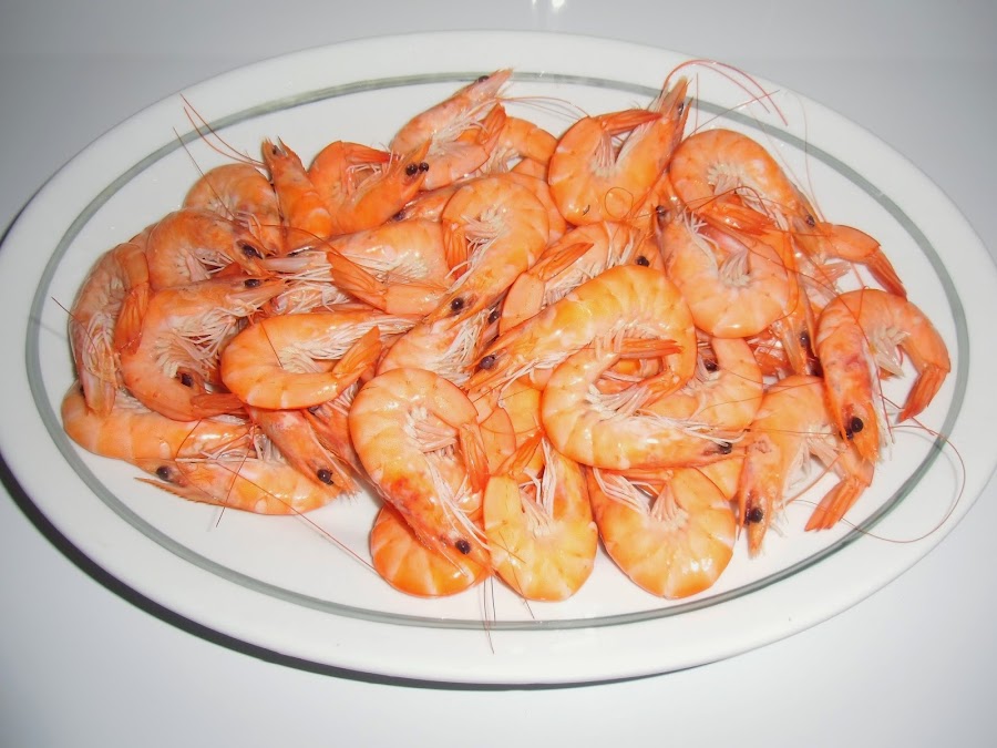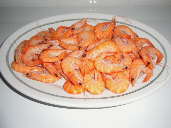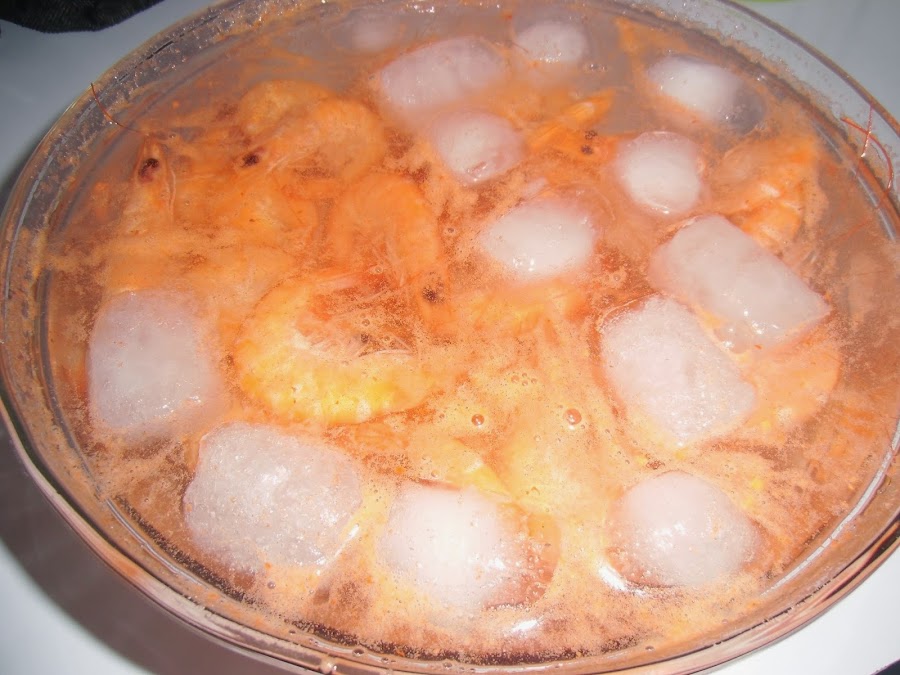 Cuando echemos los langostinos el agua dejará de hervir, esperamos un minuto o dos y el agua empezara a hervir otra vez, los langostinos habrán cambiado de color, es el momento de sacarlos con una espumadera diréctamente al agua con el hielo.