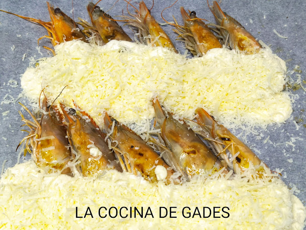 Disponemos los langostinos en una bandeja de horno, cubrimos los cuerpos con alioli y encima el parmesano rallado.