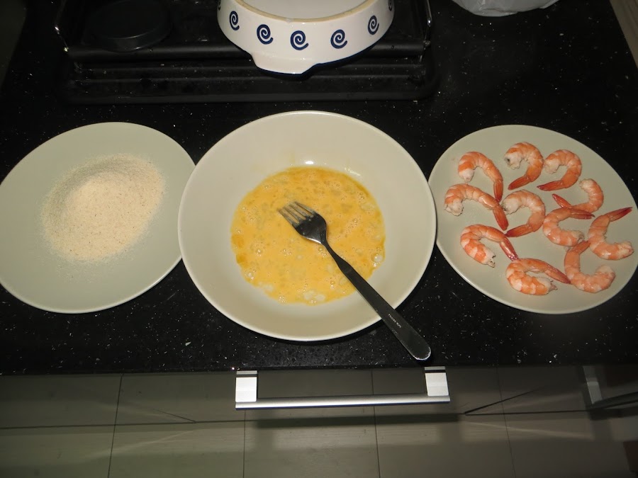 Pelamos los langostinos, les dejamos la cola para que sean más fáciles de comer, y sazonamos con un poco de sal. Los pasamos por huevo batido y pan rallado y lo vamos colocando en una bandeja apta para horno.