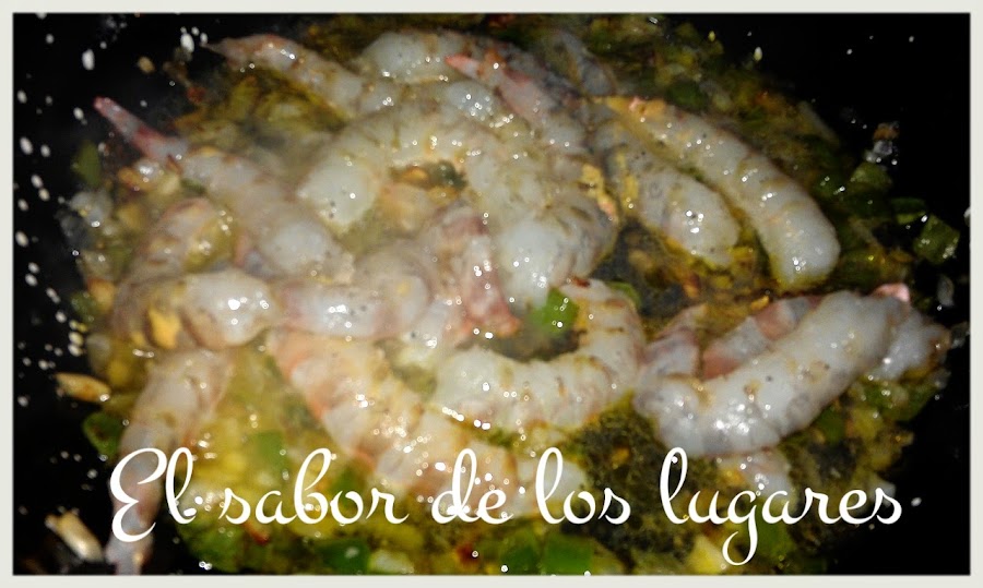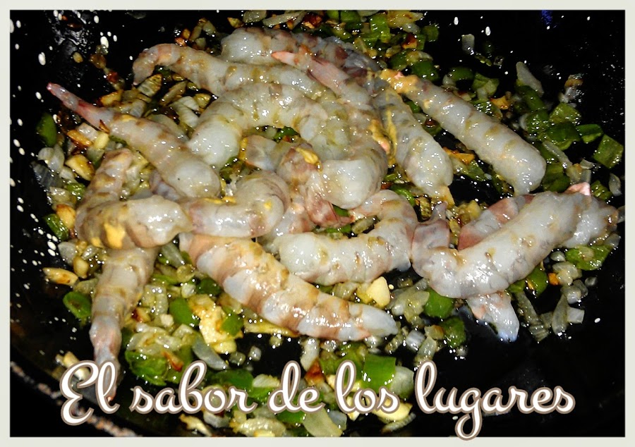 Pica finamente la cebolla, los ajos y los pimientos y sofríelos en una sartén con 2 o 3 cucharadas de aceite. Cuando la verdura esté tierna incorpora los langostinos pelados, la sal y la copa de manzanilla.