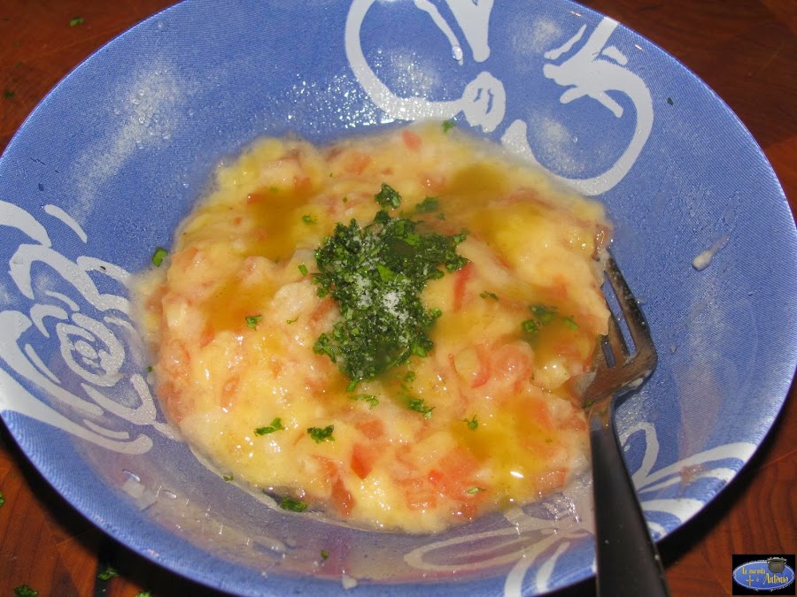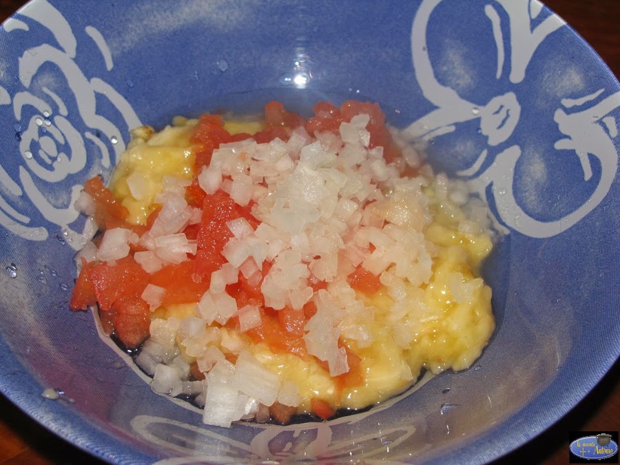 Procuraremos que el plátano no esté excesivamente maduro sino sería demasiado dulce.En bol machacamos con la ayuda de un tenedor el plátano y picamos muy fino el tomate pelado y sin semillas y la cebolleta.Le añadimos el zumo de 1/4 de limón.