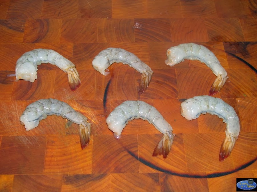 Pelamos los langostinos y preparamos una tempura con harina y agua helada.