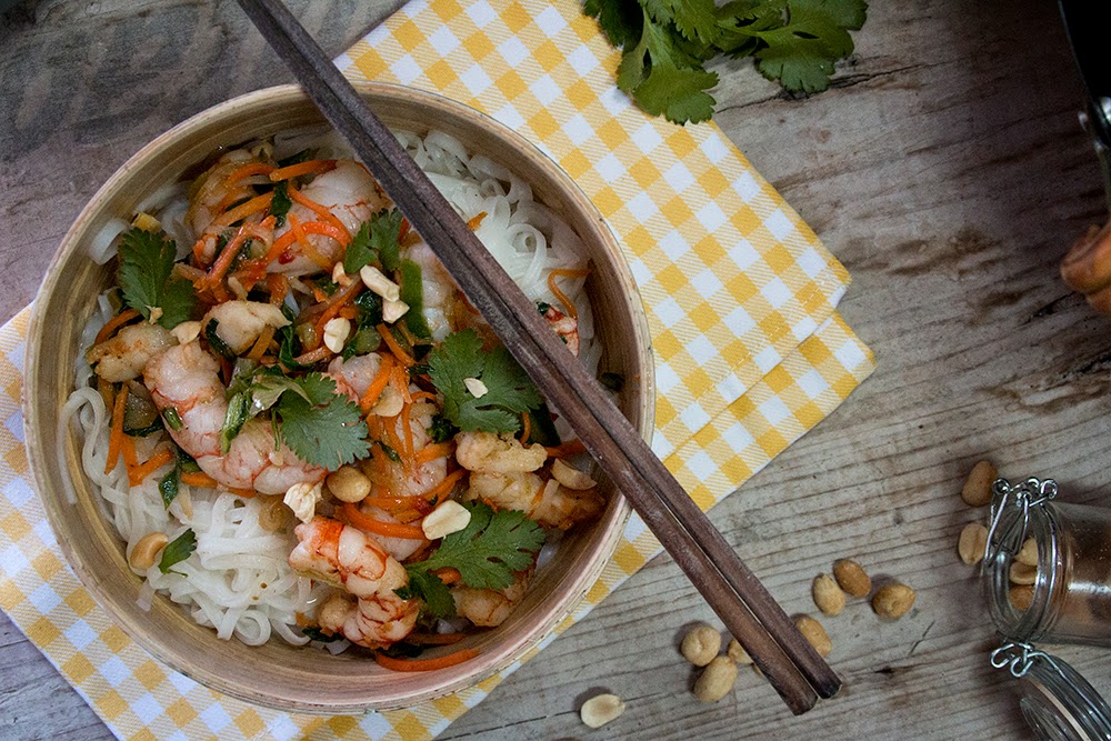 Hoy nos hemos decidido por un sencillíiiiisimo plato de langostinos thai con fideos de arroz, pero se puede acompañar tranquilamente de arroz o de otro tipo de fideos y podríais sustituir el langostino por pollo siguiendo estrictamente la misma receta, así que además de estar buena es muy versátil.