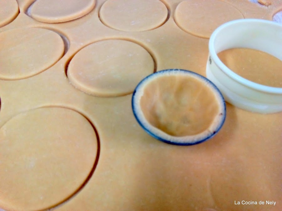 Forramos los moldes con pasta brisa para ello, cogeremos un aro mas grande del molde. lo pondremos sobre él lo acomodamos con los dedos y cortamos con un cuchillo por arriba lo que sobre.