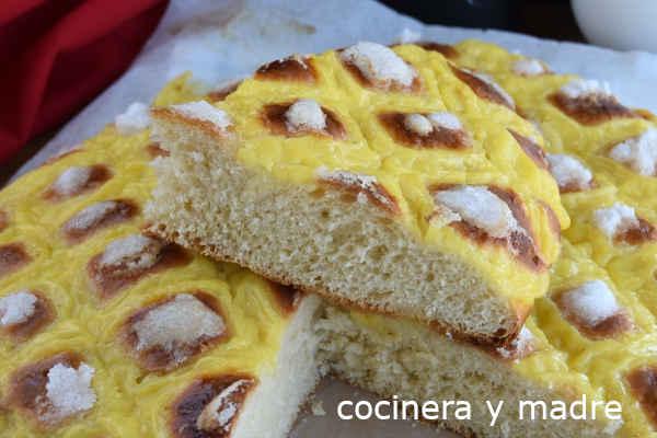 Echamos la crema pastelera en una manga y rellenamos las líneas marcadas en la larpeira gallega fácil con la crema.