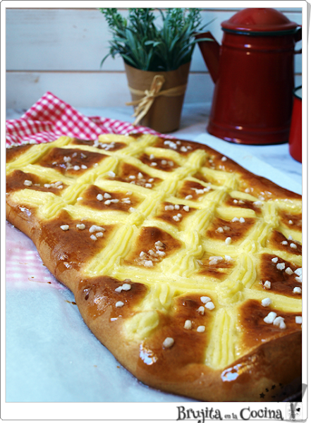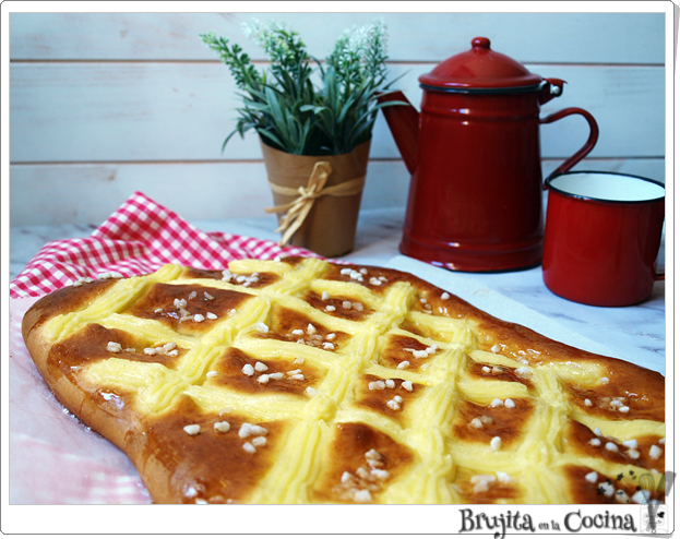 Pincelamos con huevo, hacemos cortes en forma de cuadricula transversal y colocamos crema en las ranuras, decoramos con azúcar perlado o azúcar, tapamos mientras se caliente el horno a 180ºC, una vez listo lo dejamos dentro 25 minutos.