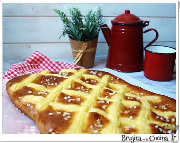 La larpeira es un dulce de bolleria que nos puede recordar al roscón, lleva crema pastelera en la superficie y va aromatizada, en este caso por anis.